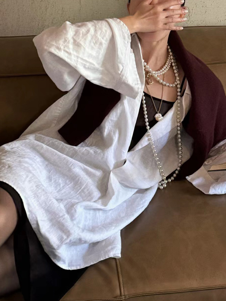 阿树阿水0328|私服系列亚麻白色开领衬衫裙/黑色人丝皱透视背心裙