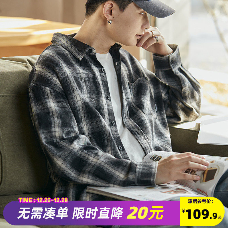 唐狮2023秋季新款棉格子衬衫男长袖复古日系休闲黑白男生格纹衬衣