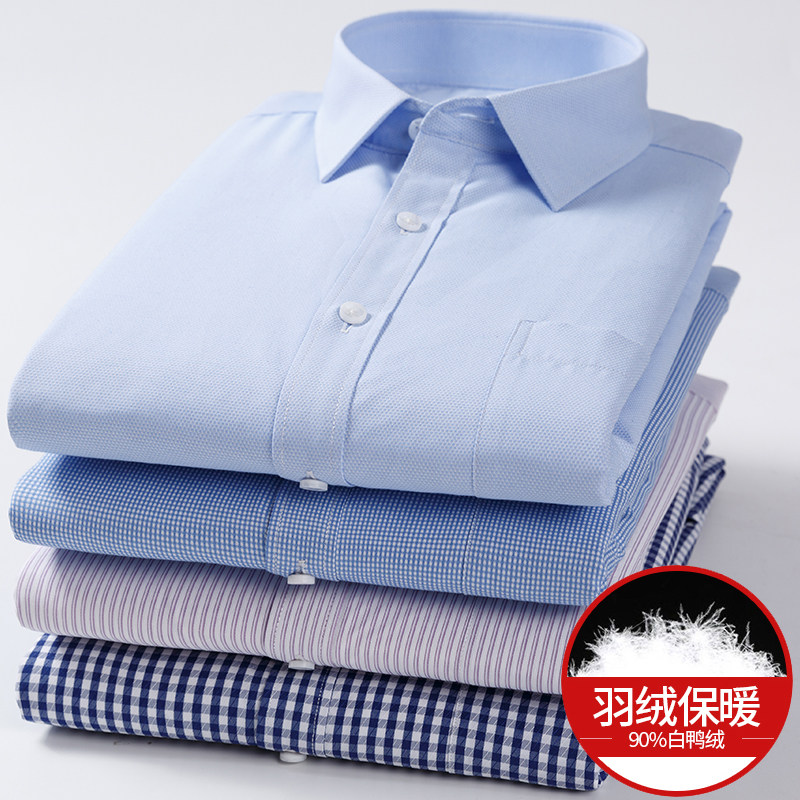 啄木鸟纯棉DP免烫白色加绒保暖衬衫男士长袖商务职业工正装蓝衬衣