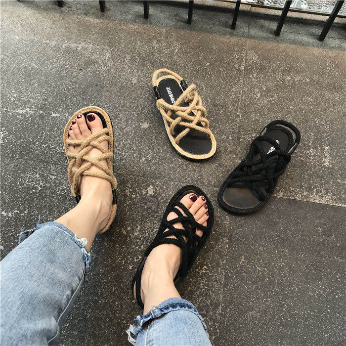 2022夏季新款草编女凉鞋平跟平底凉拖鞋女麻绳沙滩鞋交叉绑带女鞋