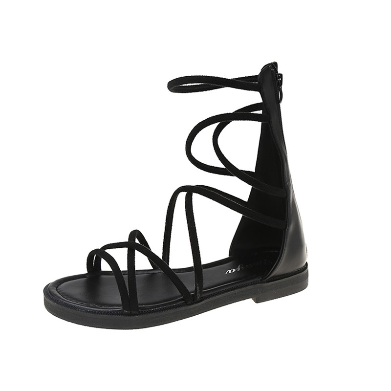 柒步森林侧拉链交叉绑带罗马凉靴平底露趾凉鞋子女夏季2023年新款