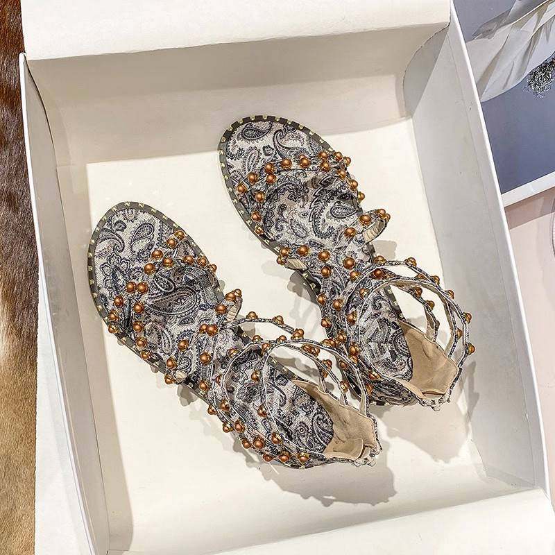 新款水钻凉鞋女夏季新款外穿法式仙女风蛇形缠绕平底绑带罗马女鞋