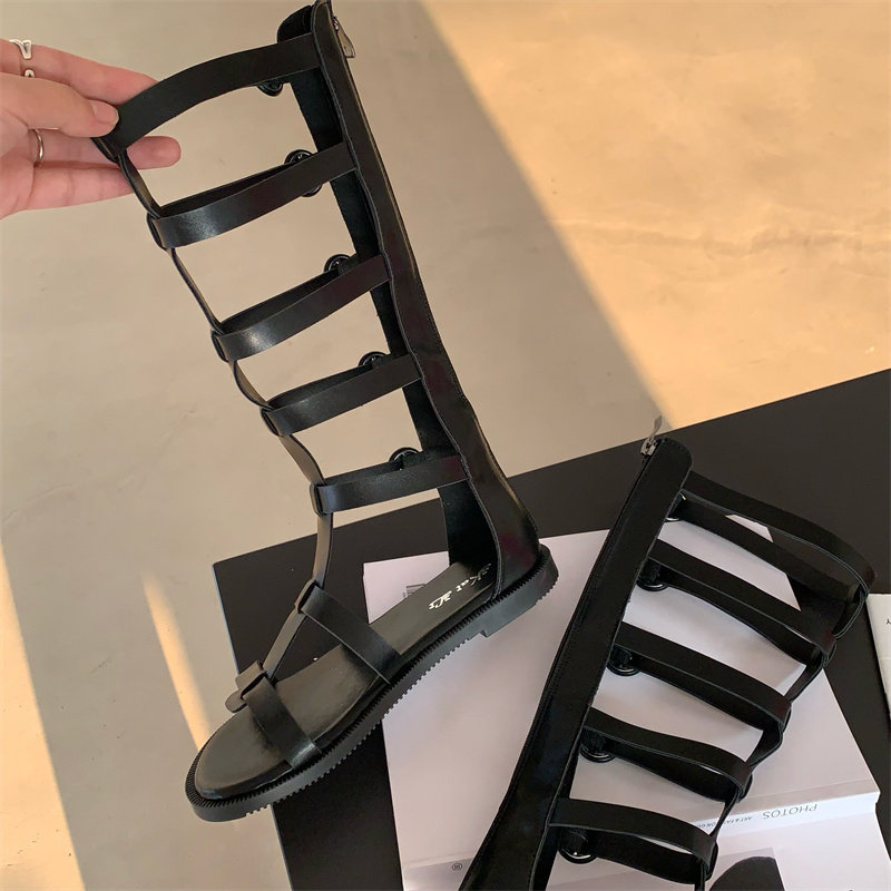2023凉鞋女夏露趾高筒镂空系带平底女鞋绑带长靴罗马大码凉靴子女