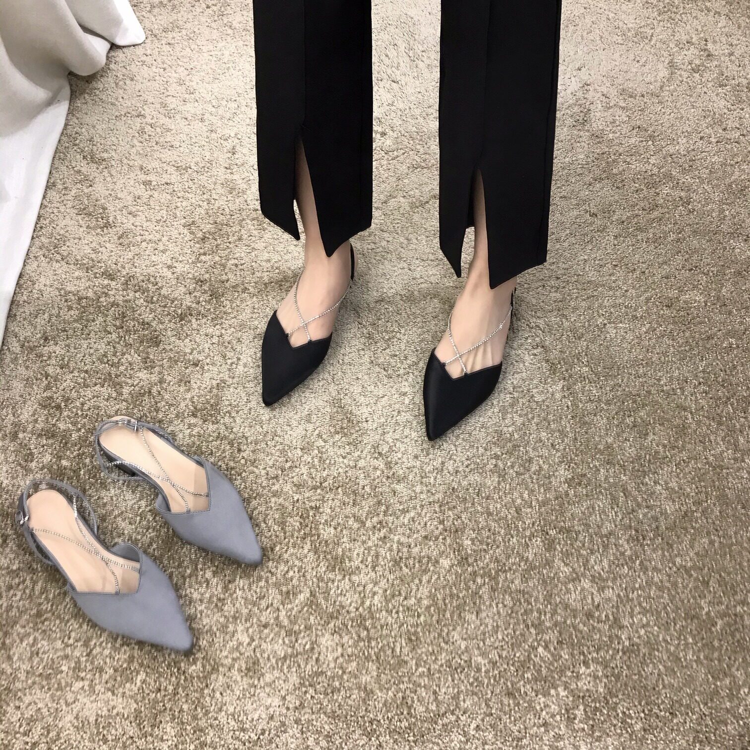 2023年夏季新款凉鞋尖头绑带纯色低跟平底凉鞋名媛风气质扣带单鞋