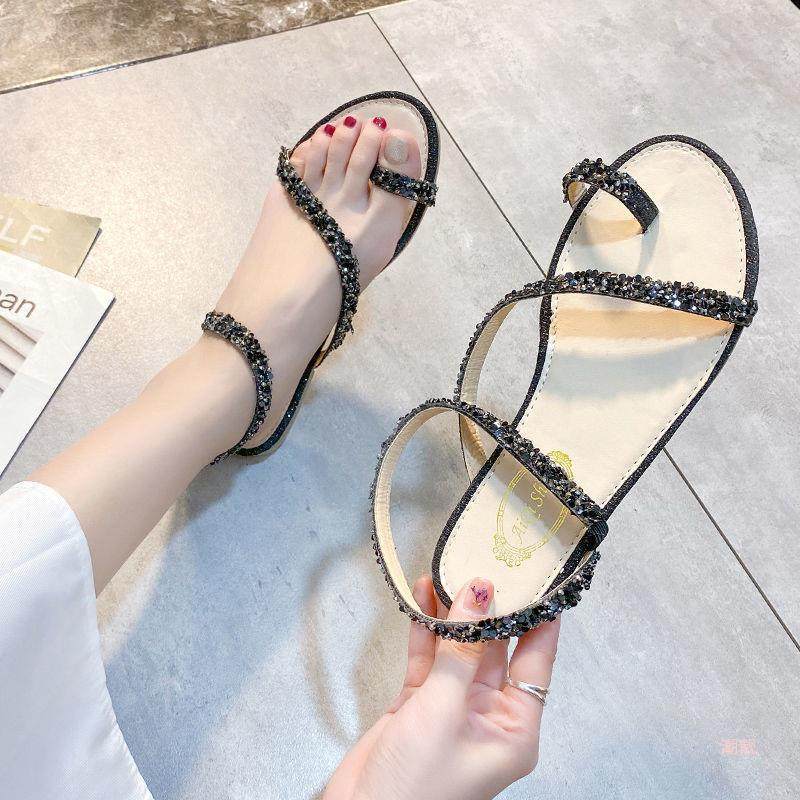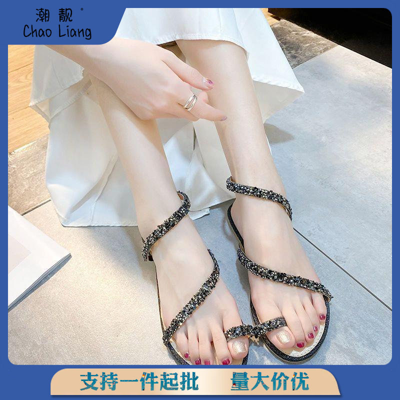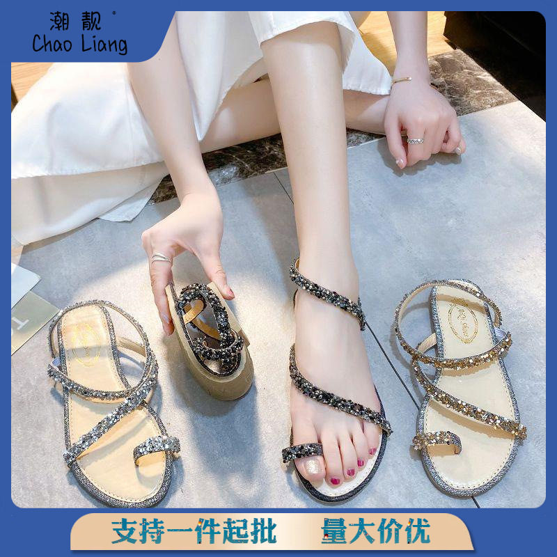 直供水钻凉鞋女夏季2023新款外穿法式仙女风蛇形缠绕平底绑带罗马