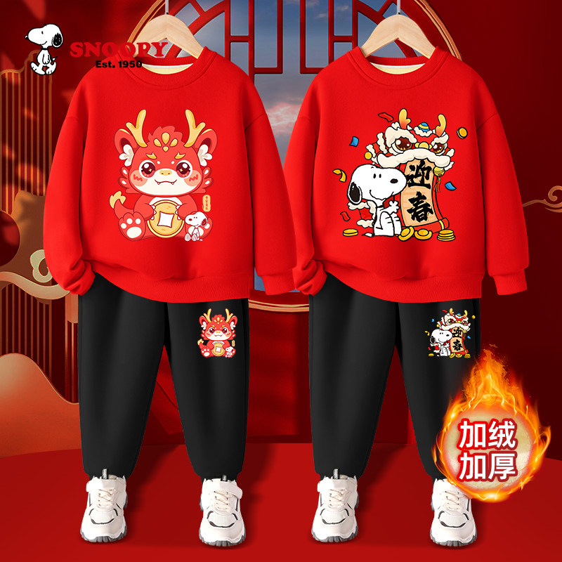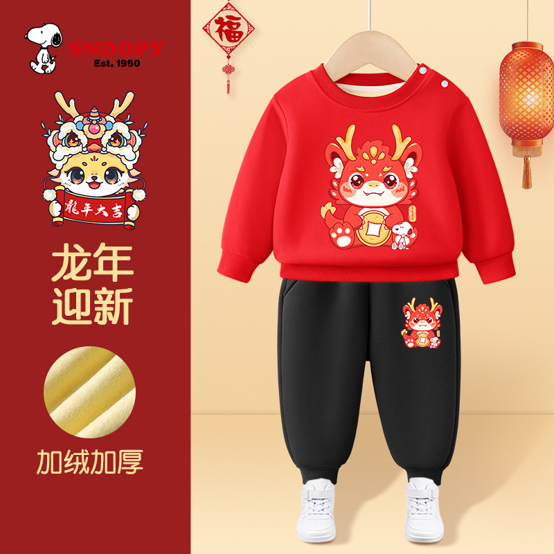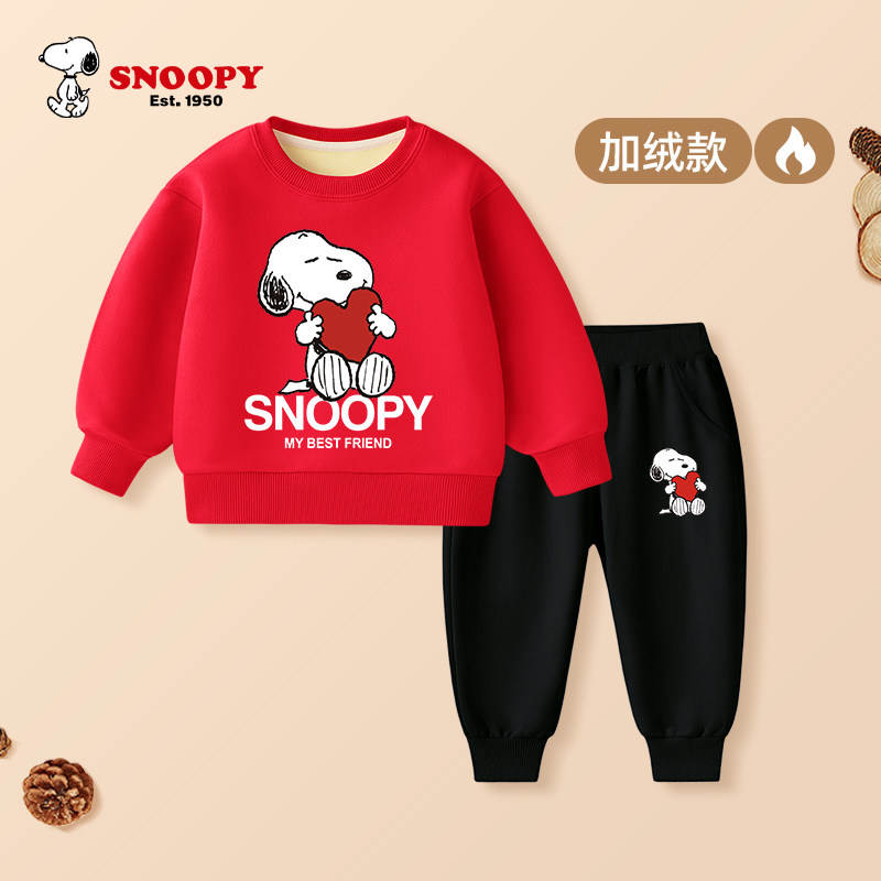 史努比男童套装2023新款男宝宝红色冬季卫衣婴幼儿童装加绒两件套