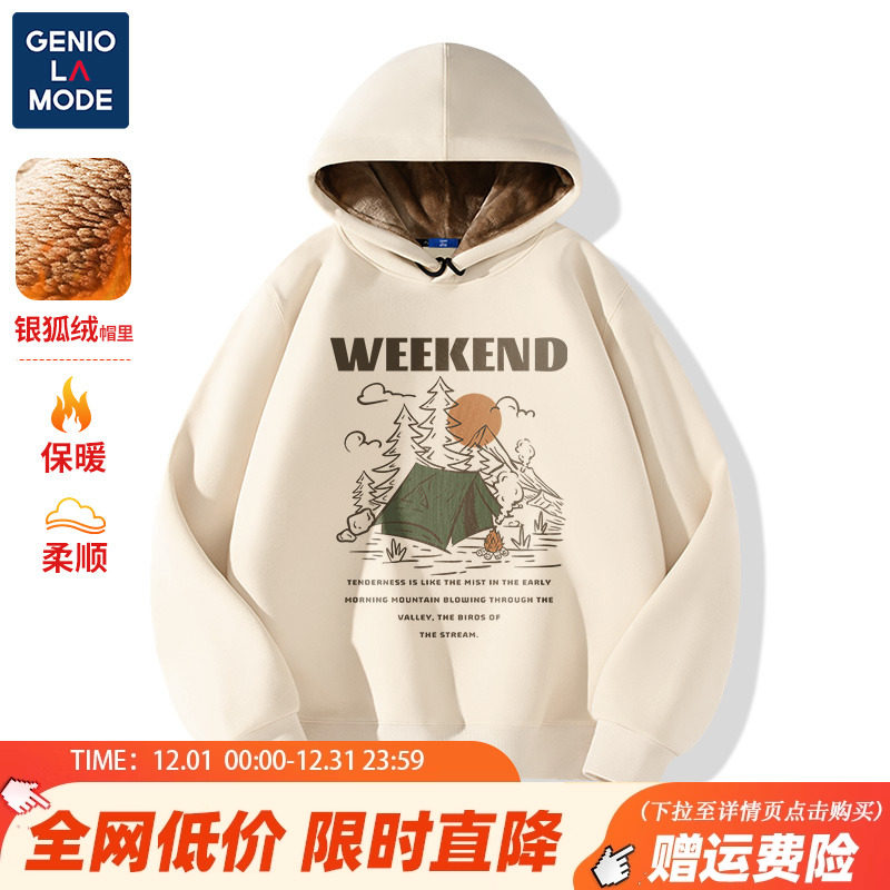 森马集团GENIOLAMODE加绒连帽卫衣男秋冬季保暖慵懒风米色外套厚
