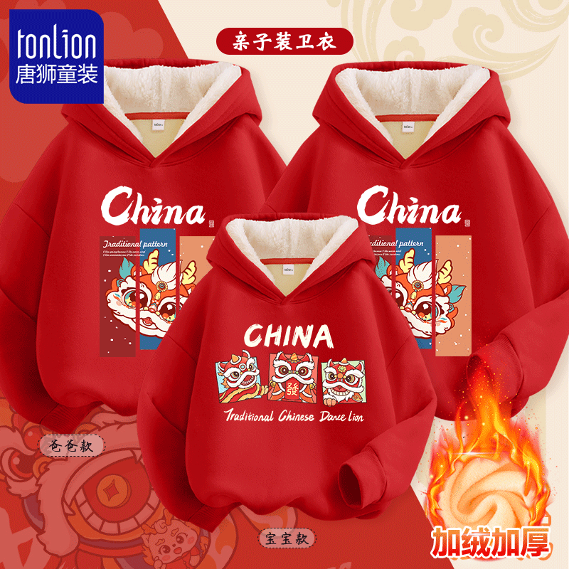 唐狮童装一家三四口亲子装秋冬款2024新年红色卫衣龙年母女拜年服