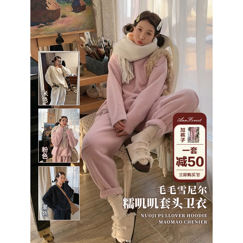 雪尼尔套头卫衣糯叽叽毛毛卫衣安妮森林圆领落肩袖宽松慵懒风上衣