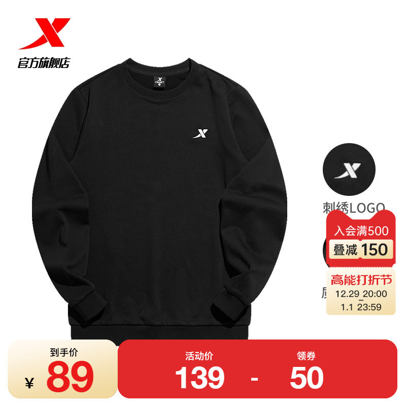 特步卫衣男秋冬男装运动服针织上衣宽松圆领长袖打底衫运动套头衫