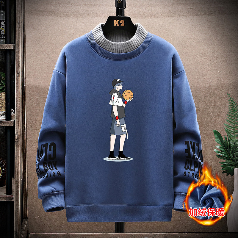 冬季加绒加厚纯色假两件休闲套装男士百搭宽松圆领卫衣卫裤两件套