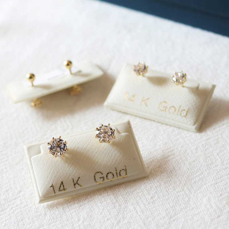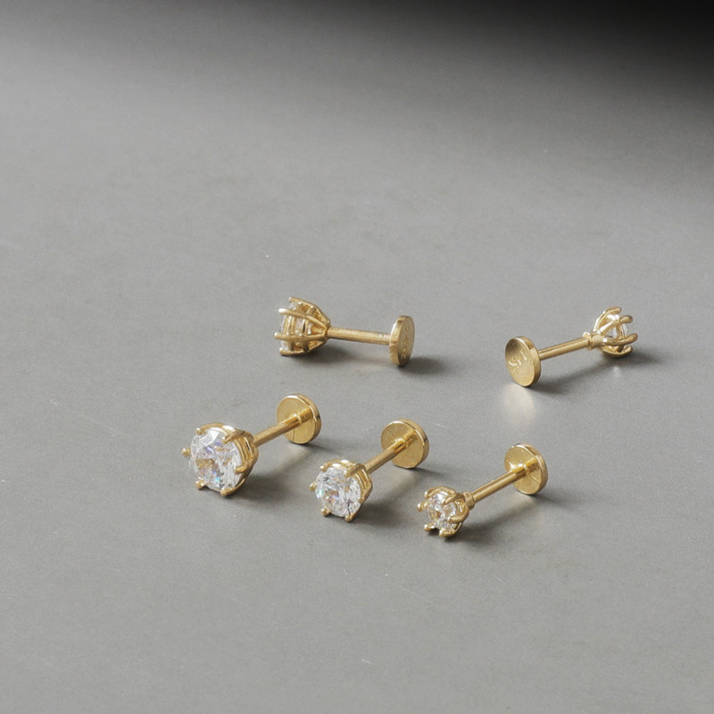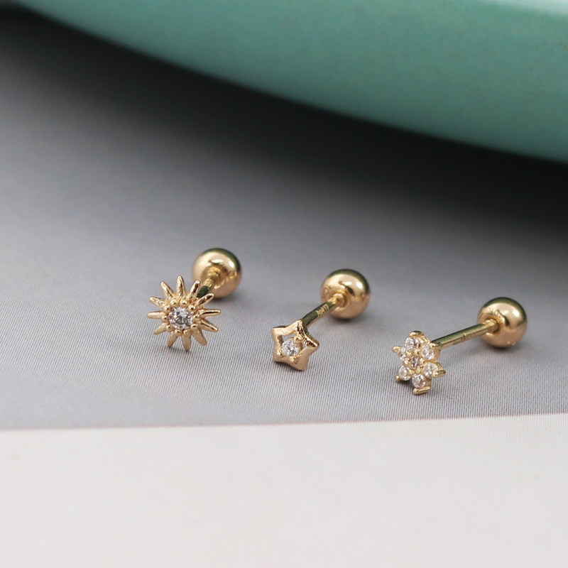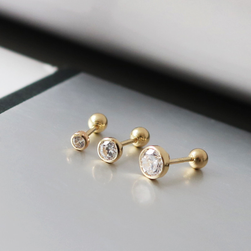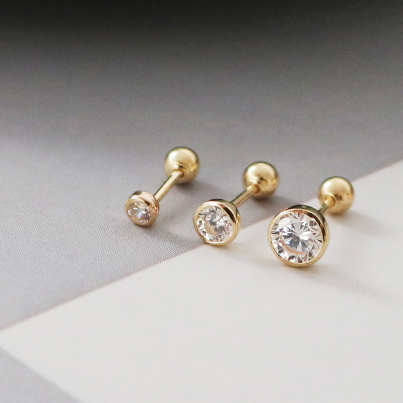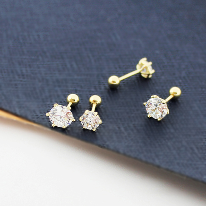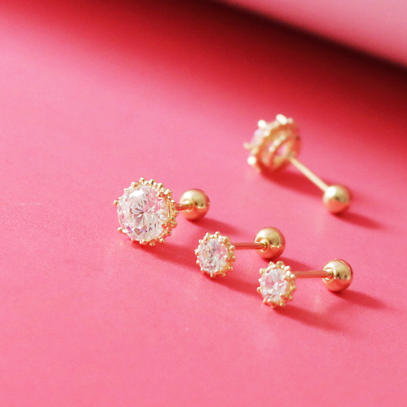 睡觉不用摘的韩国纯14K黄金耳钉 闪耀六爪锆石拧螺丝K纯金耳骨钉