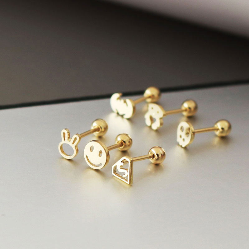 韩国纯10k金黄金耳钉 简约迷你小兔子骷髅笑脸k纯金拧螺丝耳骨钉