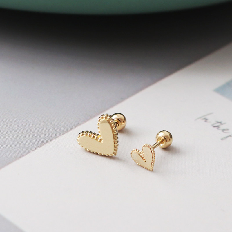 蓝莓甜心韩国纯10K金黄金耳钉 简约光面素金桃心K纯金拧螺丝耳饰