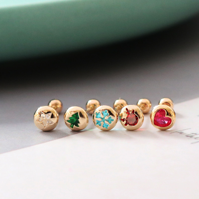 蓝莓甜心韩国纯14K金黄金耳钉 小巧精致包边闪锆K纯金拧螺丝耳饰