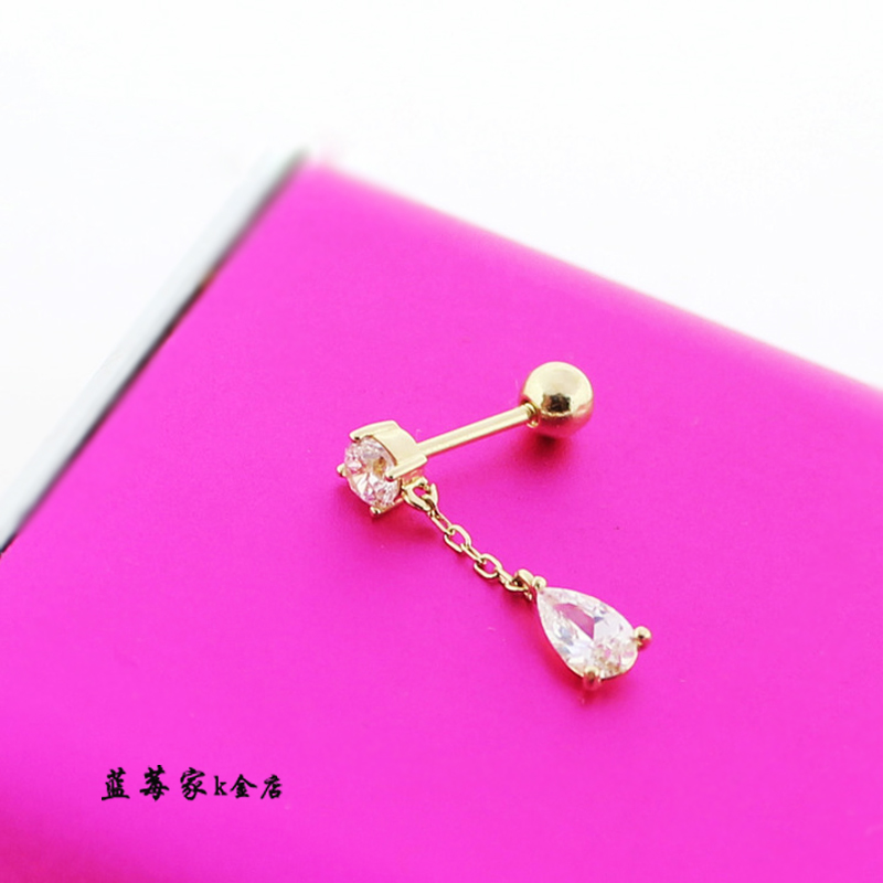 韩国纯10K金长耳钉 四爪锆石坠水滴K纯金拧螺丝耳钉流苏款耳骨钉