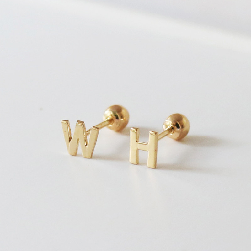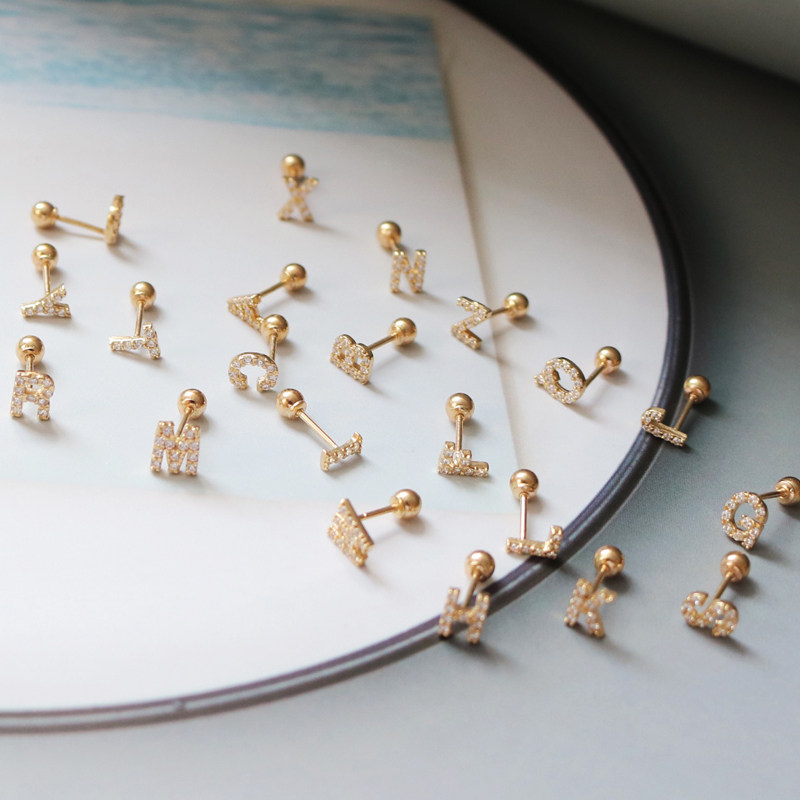 蓝莓甜心韩国纯14K金黄金耳钉 光面26个字母K纯金拧螺丝耳骨钉女