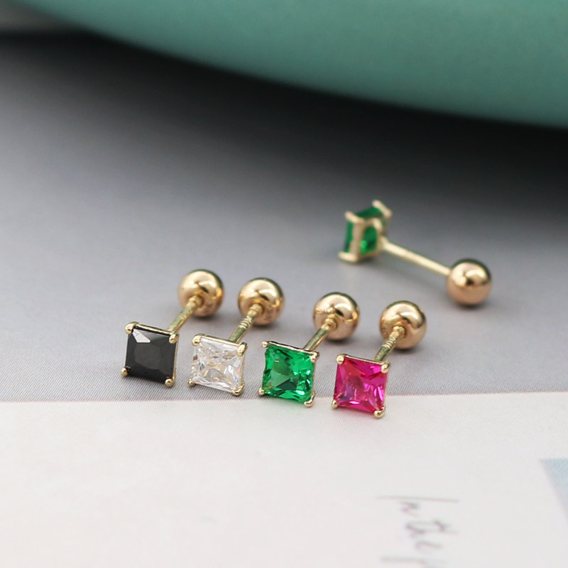 高级感~韩国正品纯14K金耳钉 平头锆石多爪k纯金耳钉女螺丝耳蜗
