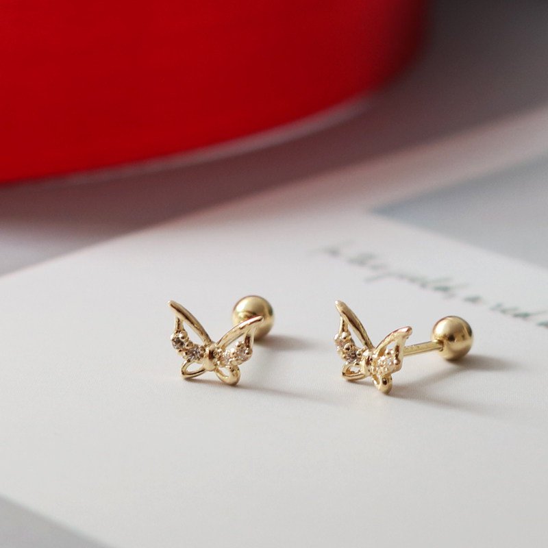 蓝莓甜心韩国纯14K金黄金耳钉 精致镂空蝴蝶微镶锆石K纯金耳骨钉