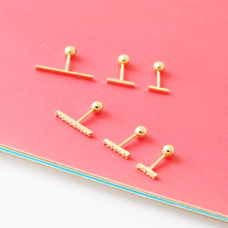蓝莓甜心韩国正品纯14k黄金耳钉 满锆一字杆拧螺丝k纯金耳骨钉女