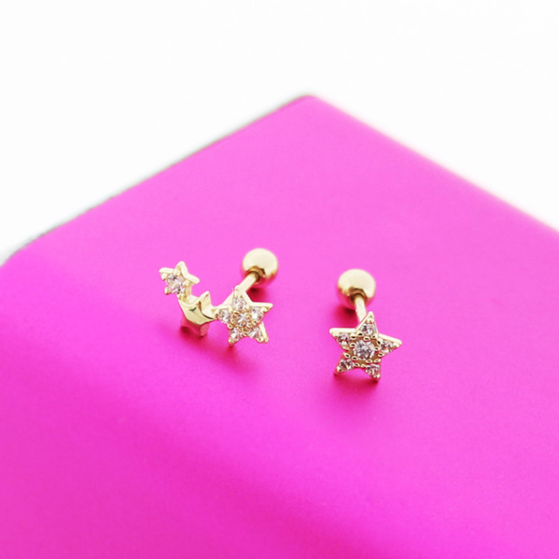 蓝莓家 韩国纯10K金黄金耳钉 精致满锆五角星拧螺丝K纯金耳骨钉女