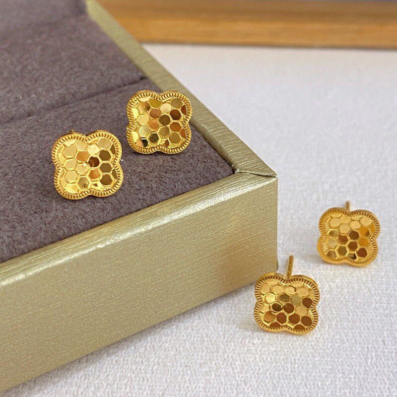 5G黄金蜂巢四叶草耳钉女款气质小众999足金耳环24K纯金幸运草耳饰