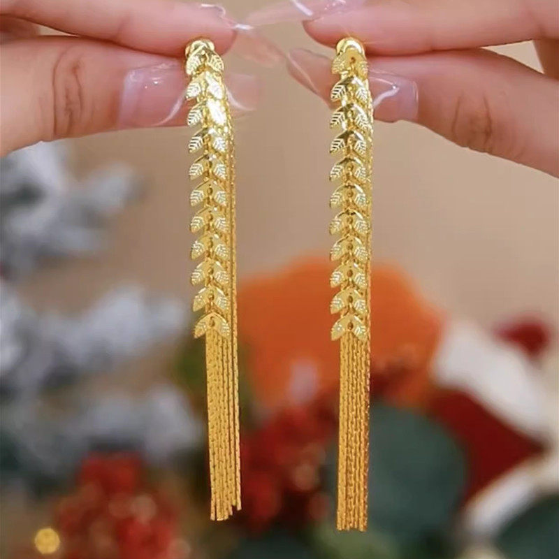 24K纯金莲花流苏耳环复古时尚5G黄金两世欢耳钉女新款999足金耳坠