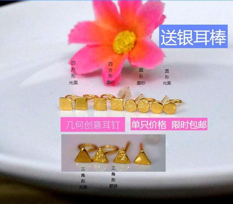 999足金小耳钉几何黄金简约图案金耳环 三角四方圆形纯金养耳棒